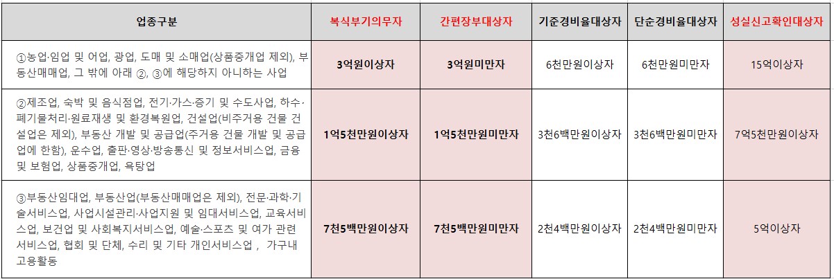 하지만 개인사업자의 경우는 모두 의무는 아닙니다. 아래 표를 참고하시면됩니다.