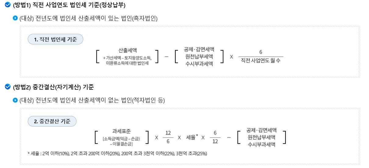 ① 직전 사업연도 납부실적 기준 ② 당해 사업연도 중간예납기간(1~6월) 실적기준(가결산방식)