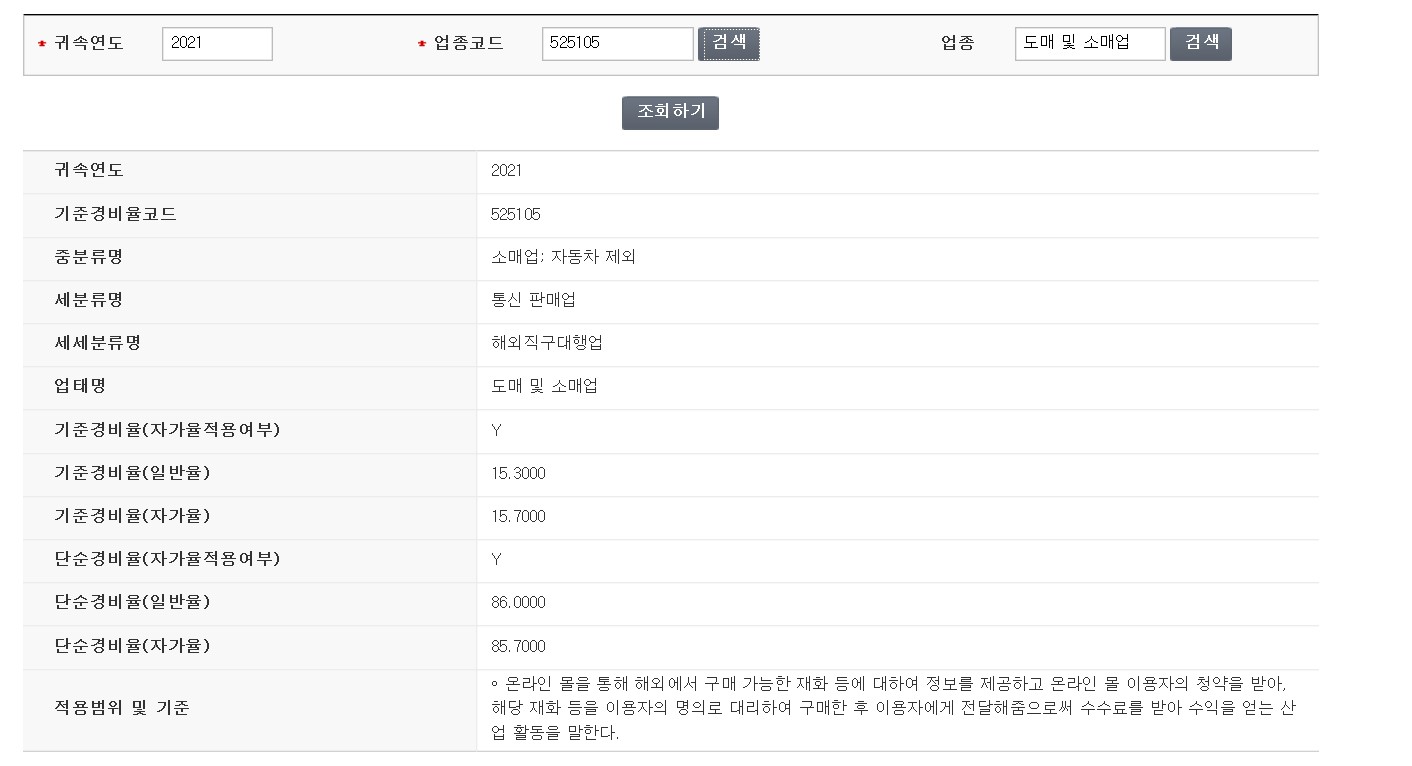 해외직구 구매대행업의 경우 위 업종코드처럼 업태가 도매 및 소매업이 아닌 서비스업으로
