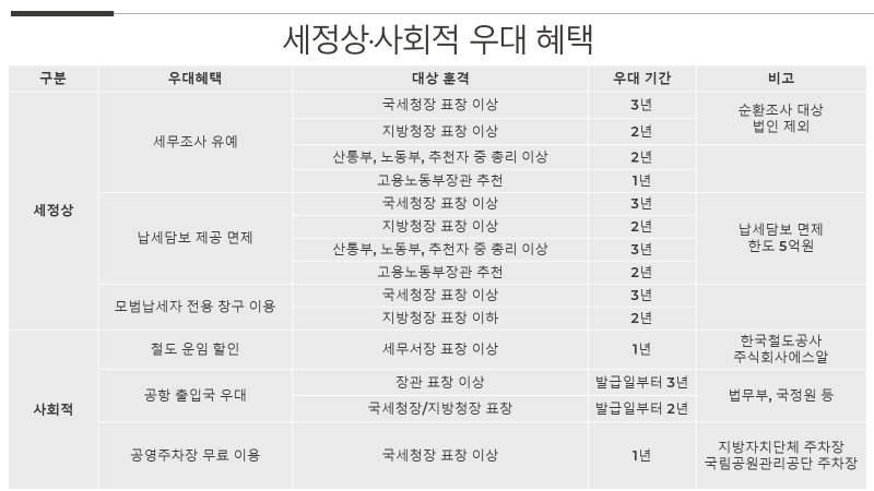 모범납세자에게는 세무조사 유예, 납세담보 제공 면제 등의 세정상 우대 혜택과