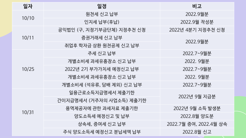 원천세 신고납부 / 부가세 예정 신고 / 간이지급명세서 제출이