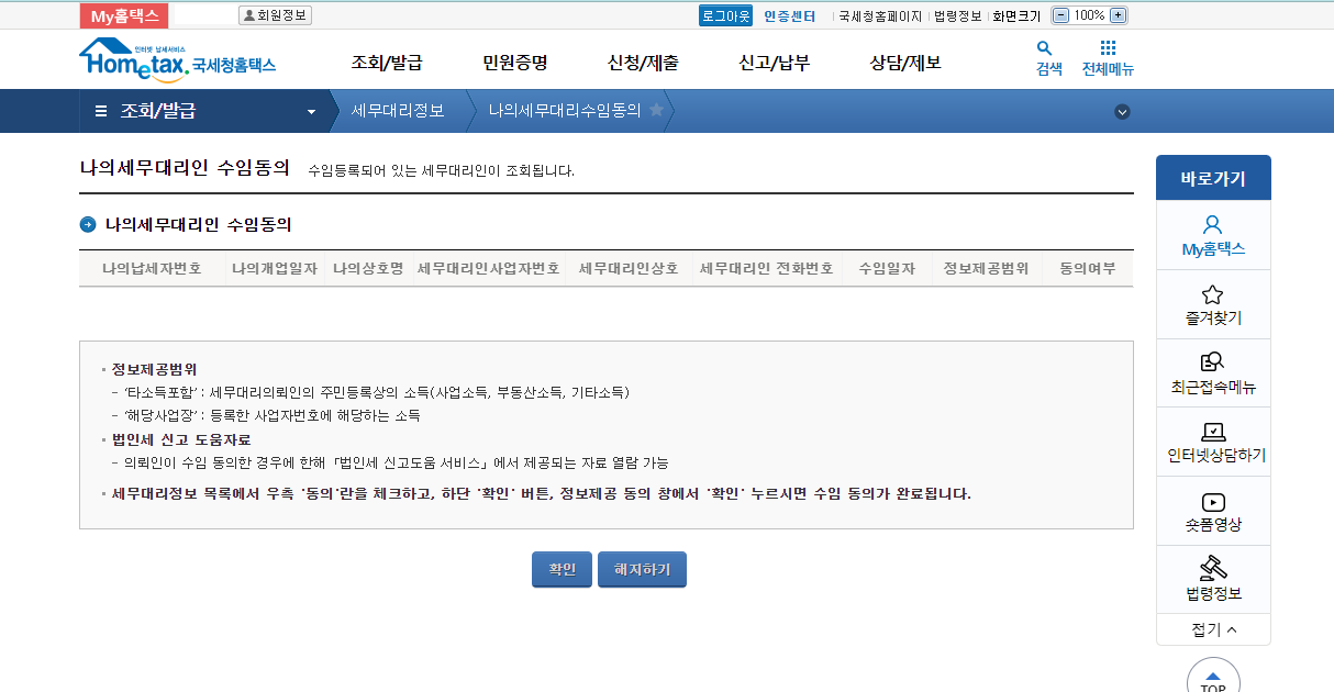 조회/발급 > 세무대리정보 > 나의세무대리수임동의에 들어갑니다