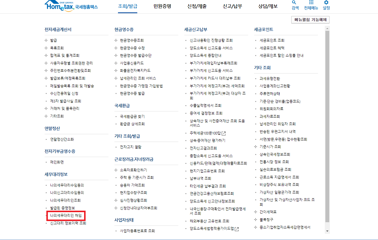조회/발급 > 세무대리정보 > 나의세무대리인 해임에 들어갑니다