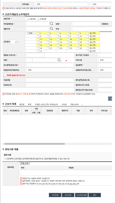 일용직 근로자가 매번 고용보험과 산재보험의 신고가 어렵기 때문에 매월 해야 하는 신고입니다