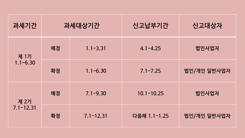 - 개인 일반사업자와 소규모 법인사업자(직전 과세기간 공급가액의 합계액이 1억 5천만원 미만)는