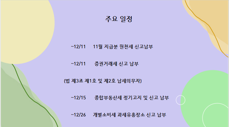 오늘은 12월 세무일정에 대해 알아보도록 하겠습니다.